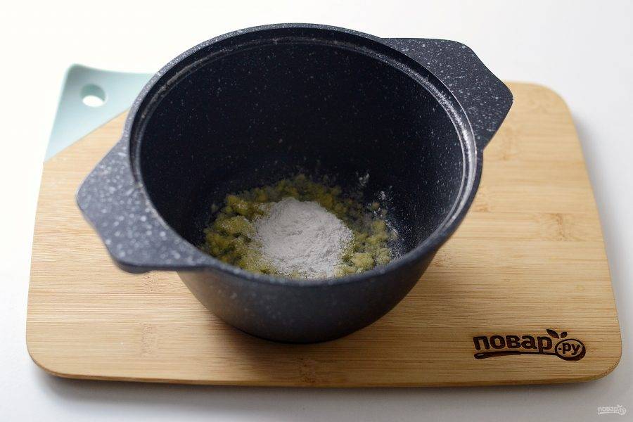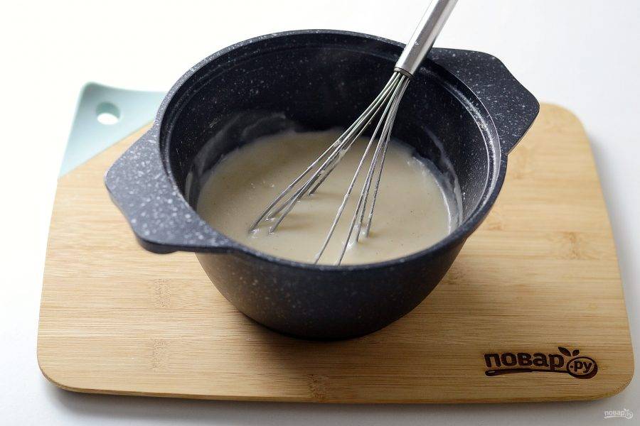 Для соуса растопите сливочное масло в кастрюльке с толстым дном. Добавьте муку, обжаривайте до легкого золотистого цвета.