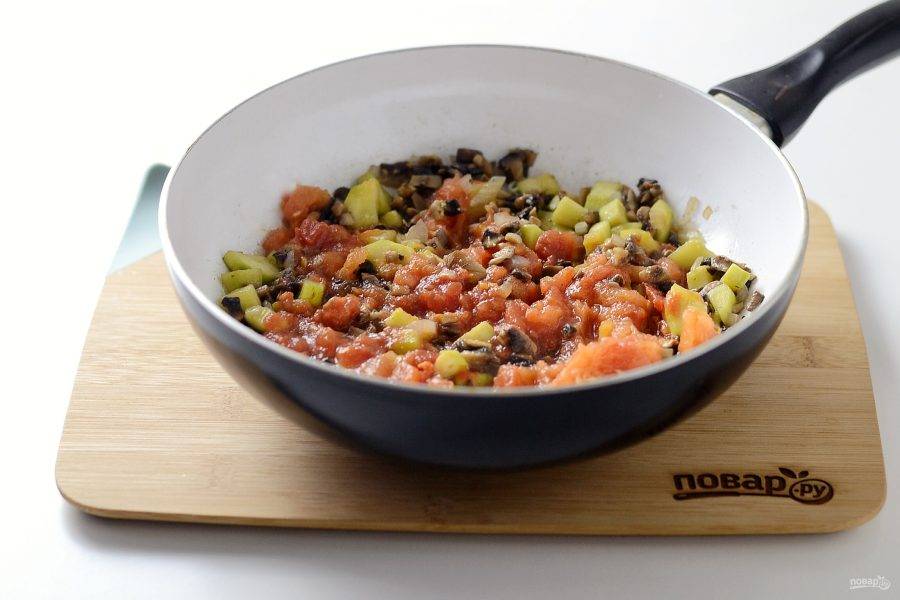 Помидоры бланшируйте, удалите семена, кожицу и мелко порежьте. Добавьте к грибам. Посолите и поперчите. Потушите все вместе до испарения лишней жидкости.
