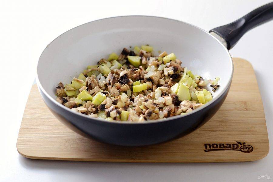 Грибы, кабачок и лук нарежьте кубиками. Обжарьте на сковороде минут 5-7 минут.