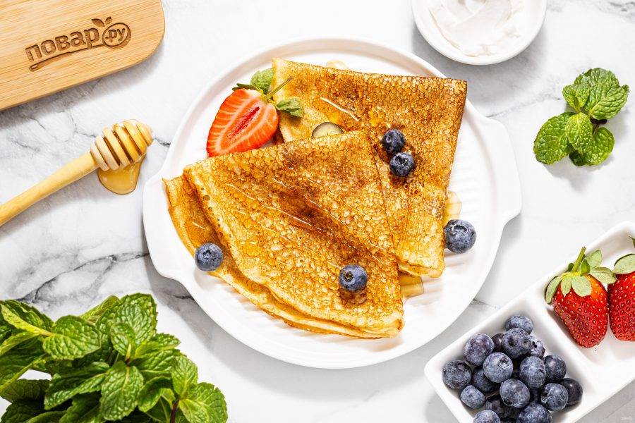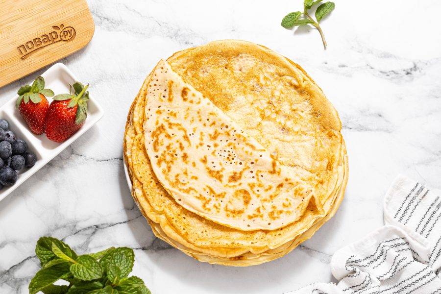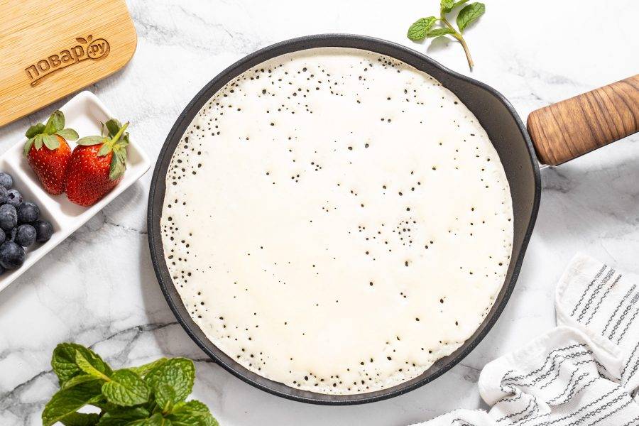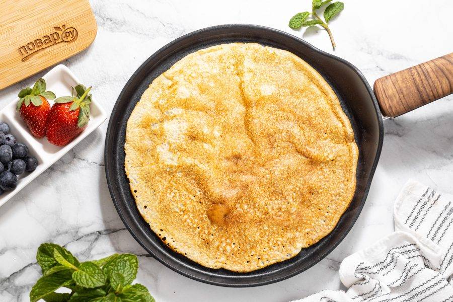 Разогрейте сковороду на среднем огне, смажьте растительным маслом. Влейте столько теста, чтобы оно равномерно распределилось тонким слоем по диаметру сковороду. Выпекайте до золотистого цвета.