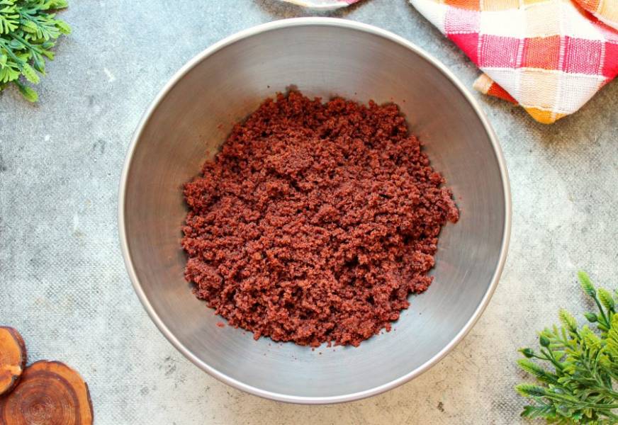 Остывший бисквит измельчите в крошку любым удобным способом. Переложите крошку в миску.