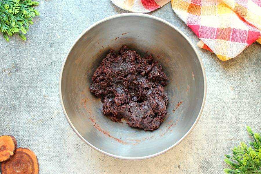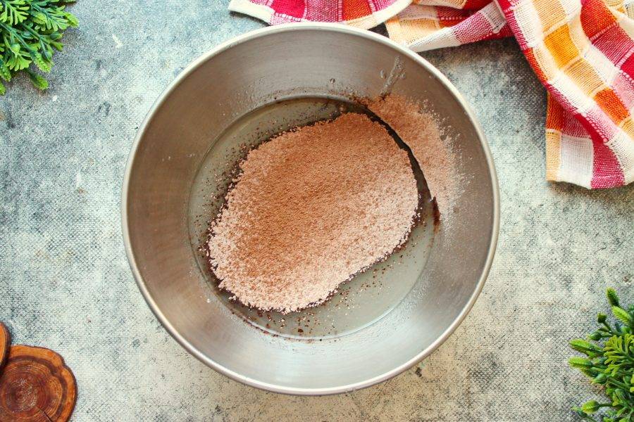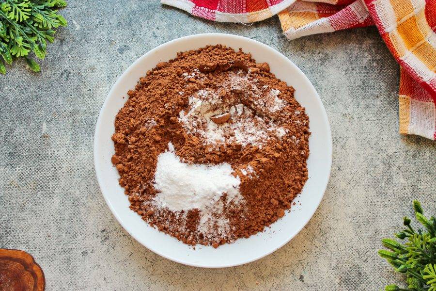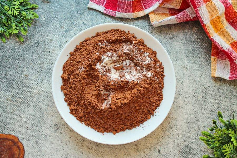 Добавьте к муке с какао соду и разрыхлитель. Все хорошо перемешайте венчиком до равномерного распределения ингредиентов.