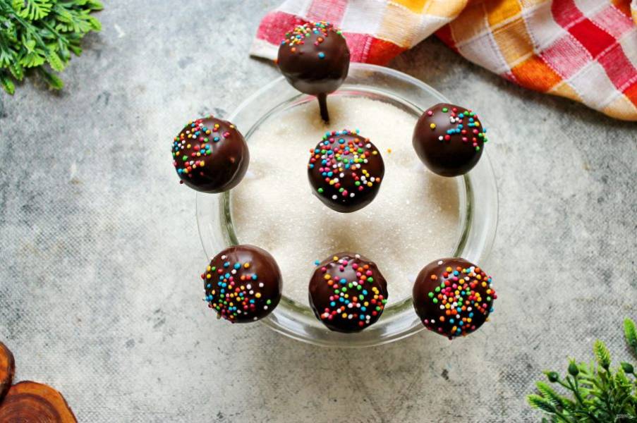 Снова растопите шоколад, если он застыл, и остудите до температуры 35-40 градусов. Влейте в шоколад растительное масло и перемешайте силиконовой лопаткой до однородности. Достаньте кейк попсы из морозильной камеры и опустите в подготовленную глазурь. Сразу украсьте по своему вкусу, так как глазурь практически сразу застынет.
