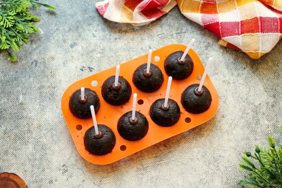 Достаньте шарики из холодильника. Палочки для кейк попсов опускайте одним концом в шоколад и сразу вставляйте в шарики. Уберите заготовки в морозильную камеру на 25 минут, до застывания шоколада.