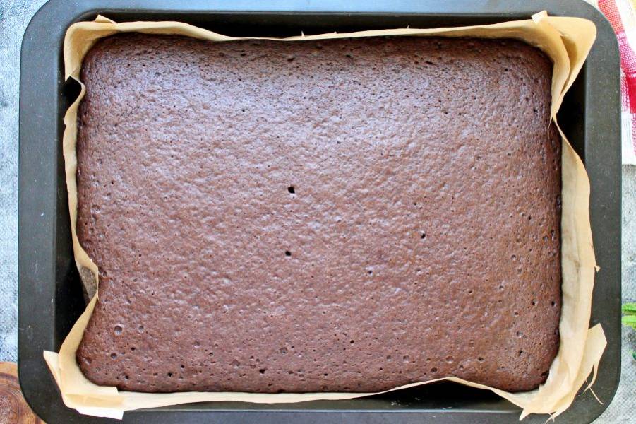 Поставьте противень в горячую духовку и выпекайте при температуре 180 градусов в течение 25-35 минут, до сухой шпажки. Бисквит достаньте из духовки и остудите, полностью не вынимая.
