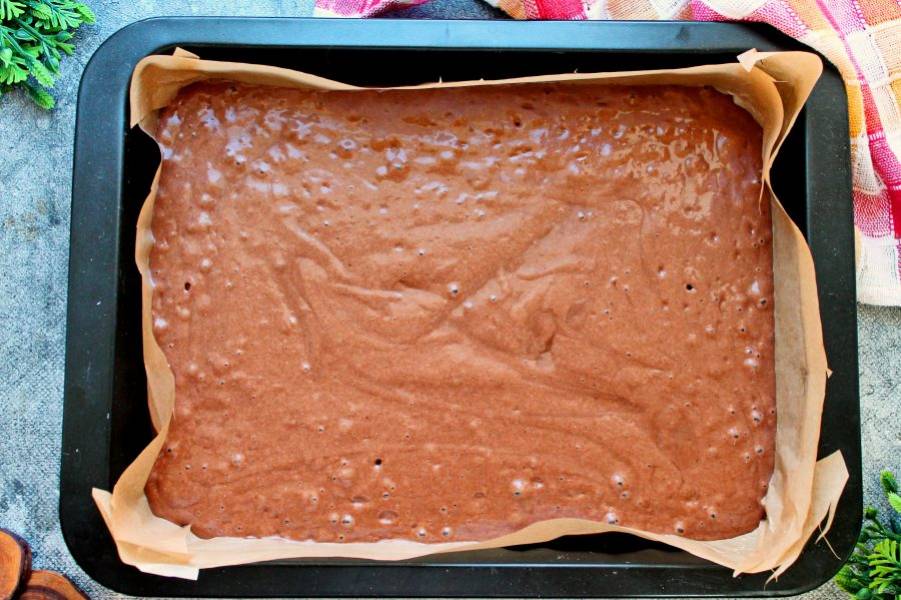 Противень с высокими бортиками 25 на 30 сантиметров застелите пергаментом с силиконовым покрытием и переложите тесто. Верх разровняйте лопаточкой.