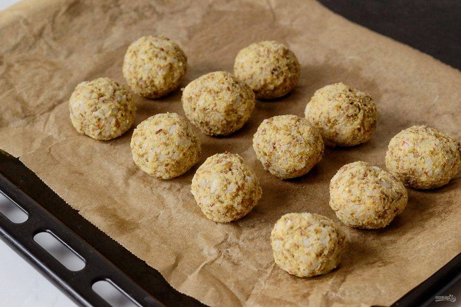 Скатайте из фарша шарики. Выложите на противень и запекайте в духовке 20-25 минут при температуре 200 градусов.
