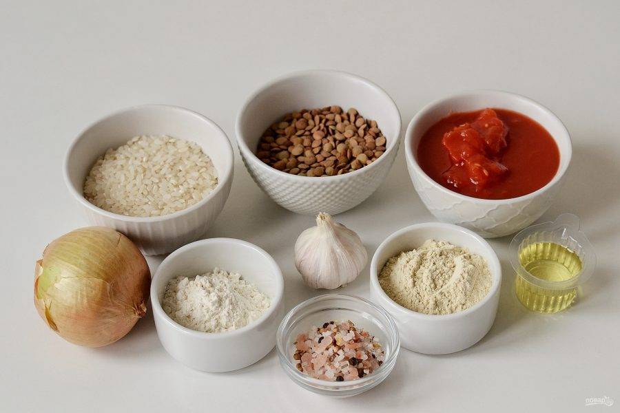 Подготовьте все ингредиенты. Чечевицу залейте кипятком и оставьте на полчаса.