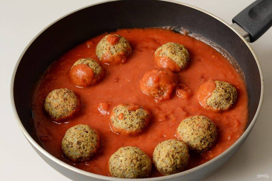 Выложите тефтели в сковороду, залейте подливкой. Потушите 15-20 минут на медленном огне под крышкой.
