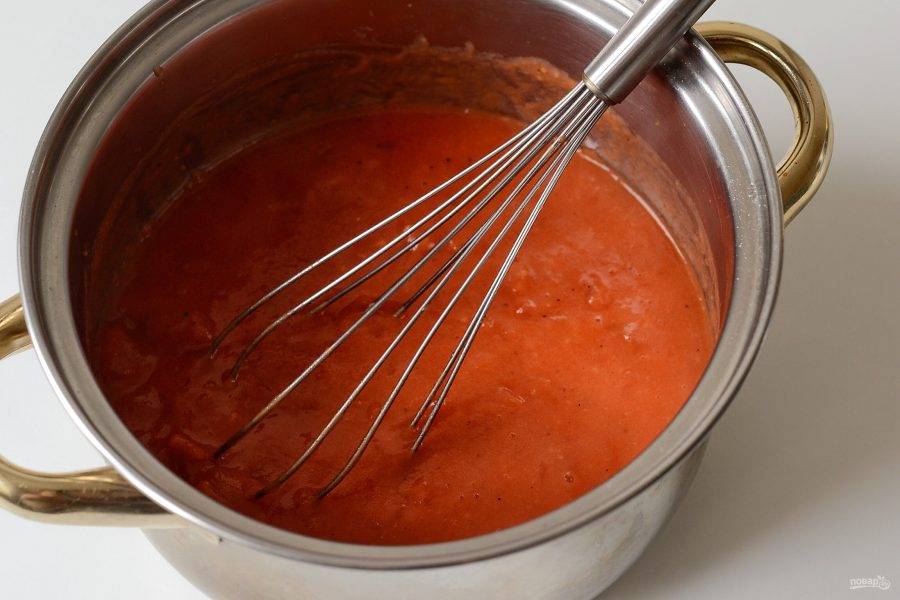 Добавьте рубленые томаты в собственном соку, постоянно помешивая венчиком. Посолите и поперчите по вкусу. Прогрейте на медленном огне до загустения. При необходимости можно подлить немного горячей воды, если получится слишком густо.