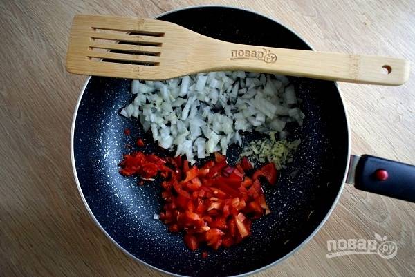 Лук, имбирь, перец сладкий и острый измельчите. Пассеруйте на разогретом растительном масле до мягкости в течение 3-4 минут.