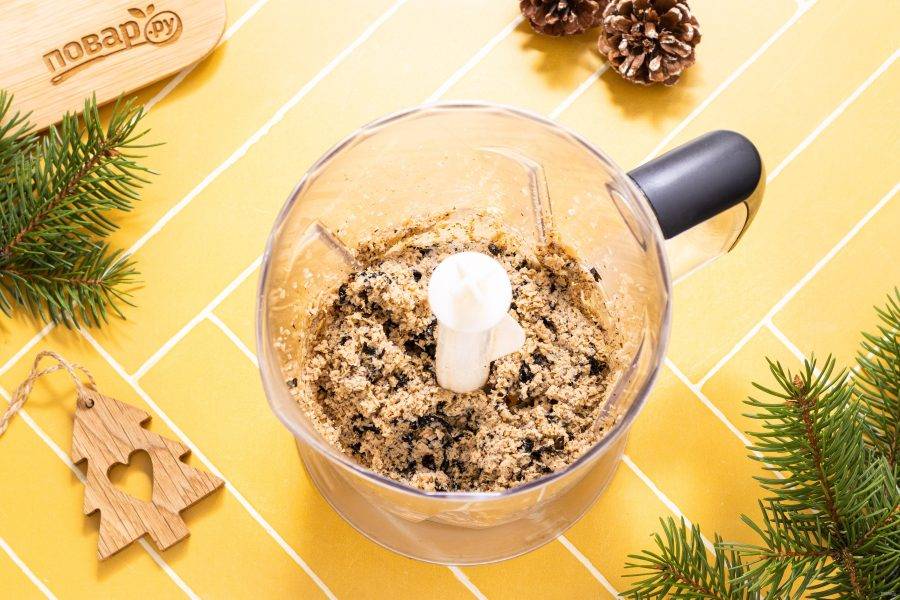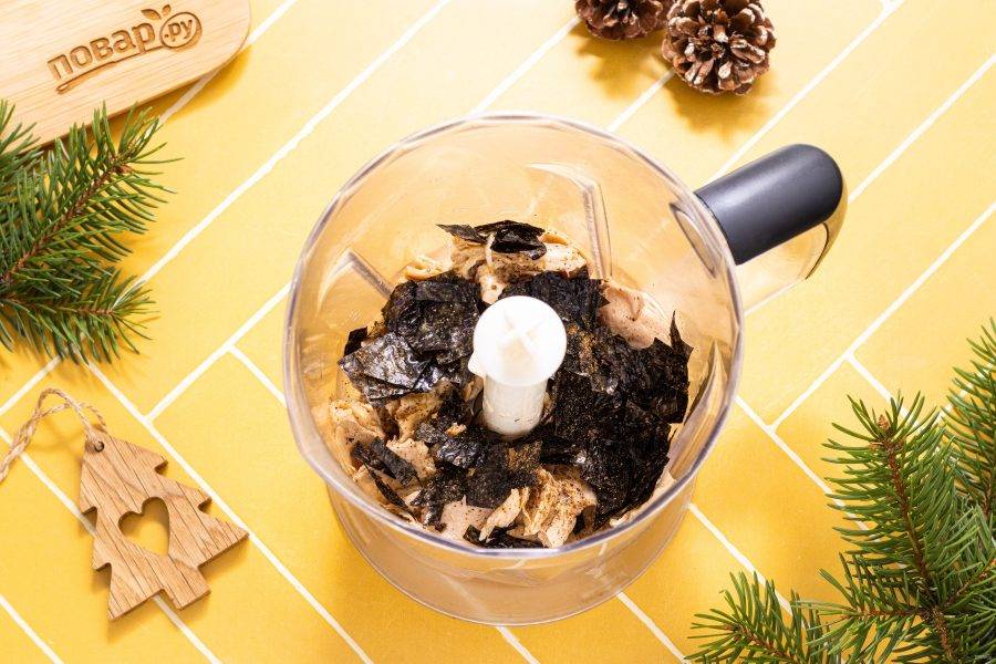Переложите соевые кусочки в блендер. Добавьте мелко порезанный лист нори, посолите и поперчите по вкусу, влейте растительное масло и растительный «рыбный» соус.