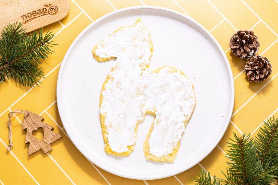 Выложите по форме лошади слой из картофеля толщиной примерно 5-7 мм. в плоскую тарелку.