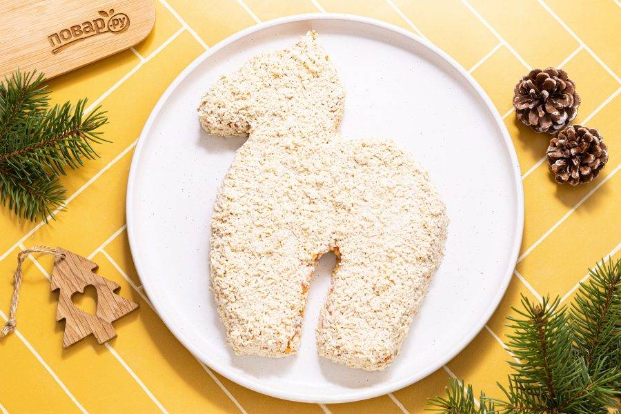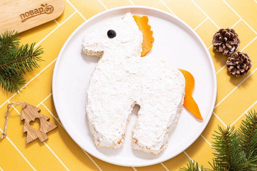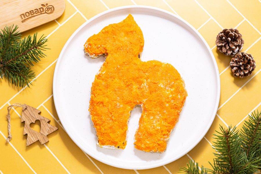 Хорошо смажьте последний слой постным майонезом. Подправьте все неровности, уберите крошки. Из кусочков вареной моркови сделайте гриву и хвост для лошади, а из маслины глаз. После можно добавить декора салату на свой вкус. Затем желательно убрать салат на пару часов в холодильник, чтобы он настоялся.