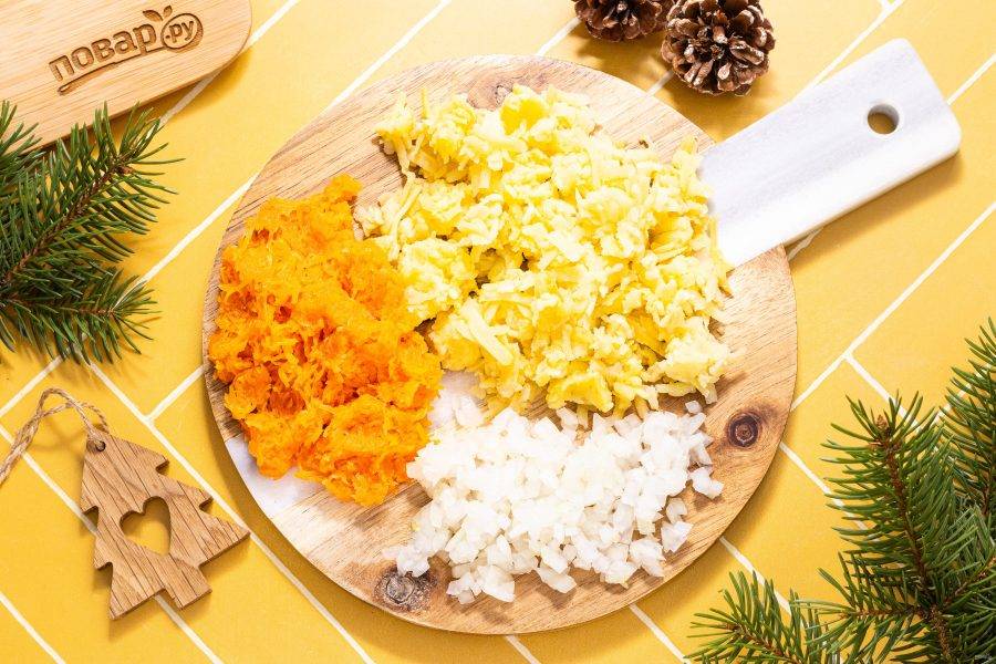 Очистите и натрите на тёрке картофель с морковью. Лук нарежьте на мелкие кубики, ошпарьте кипятком и промойте в холодной воде, отожмите и откиньте на сито.