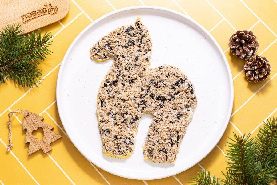 Последний слой выложите из тертого тофу. Им же покройте бока лошадки.