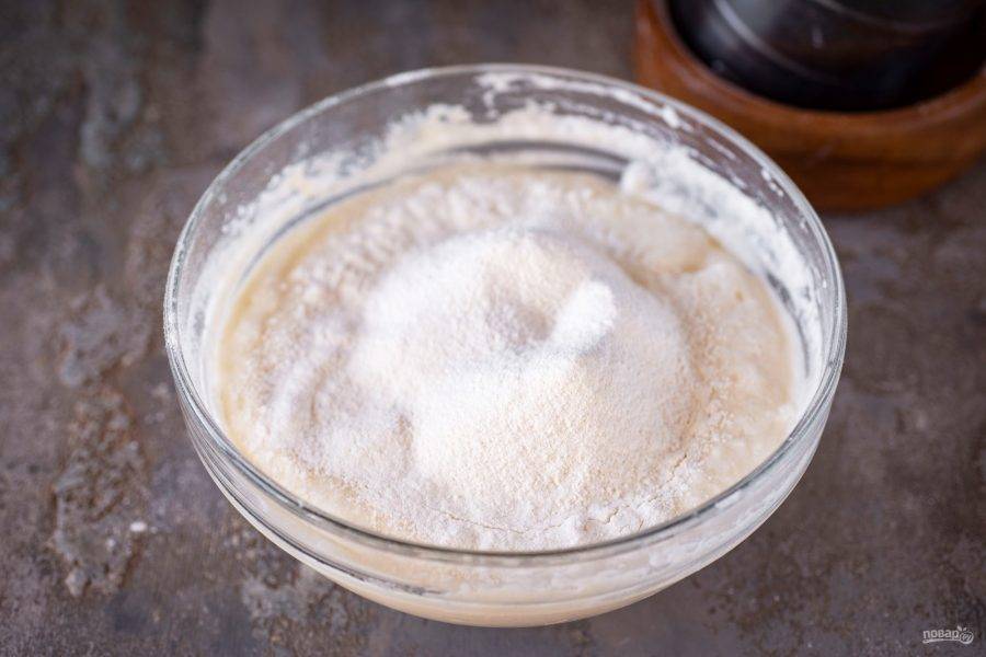 Добавьте эту сдобную смесь в миску к уже подошедшей опаре и перемешайте ложкой.