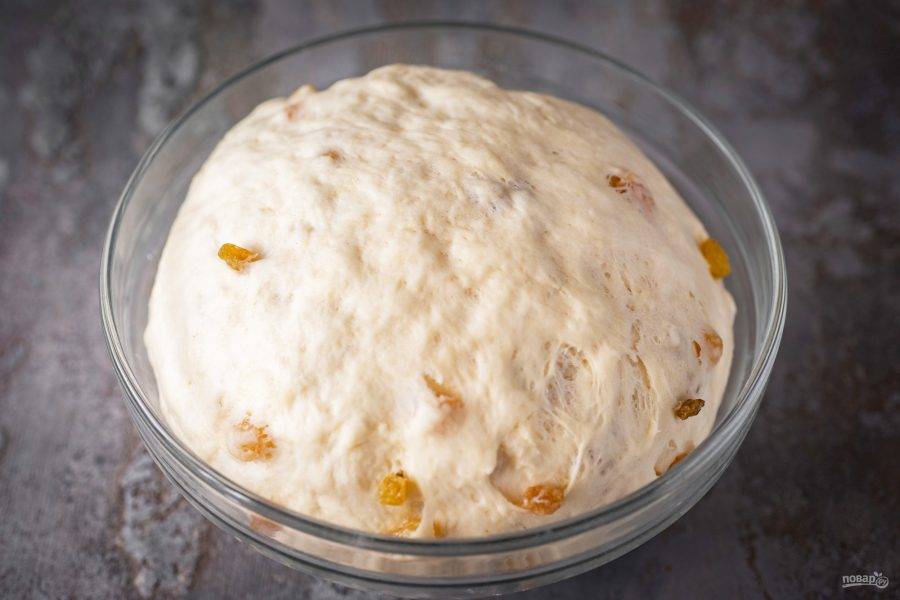 Добавьте к тесту изюм и вмешайте его руками. Тесто в миске округлите, накройте миску с тестом кухонным полотенцем и оставьте подходить тесто на 1 час в теплом, без сквозняков месте.