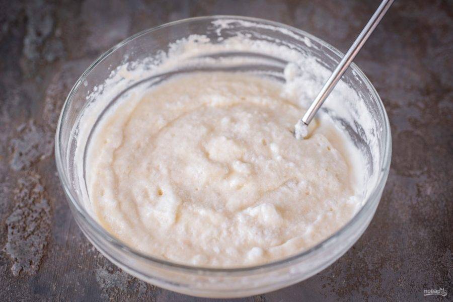 Перемешайте все до исчезновения мучных комочков — это опара. Оставьте миску с опарой в покое на 30 минут, предварительно миску накрыв кухонным полотенцем.