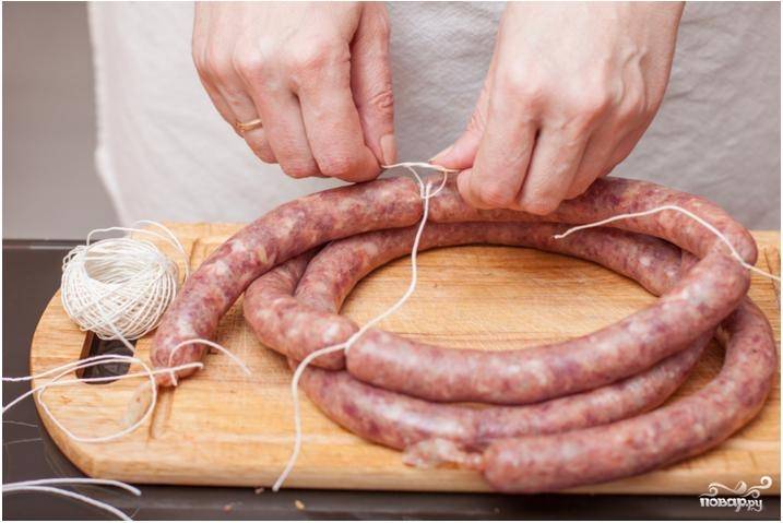5. Перевяжите начиненную череву толстой хлопковой или льняной ниткой так, чтобы получились колбаски длиной около 20 см. Поместите их в пакет и положите в холодильник на 24 часа для вызревания.