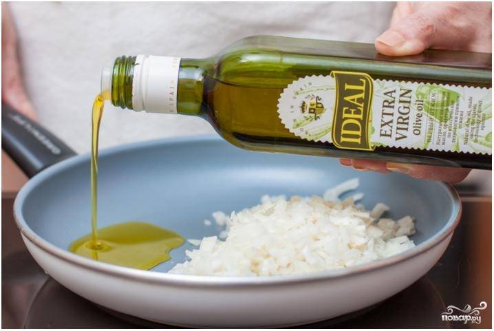 2. Репчатый лук нарежьте мелкими кубиками и обжаривайте на оливковом масле, пока он не приобретет золотистый цвет.
