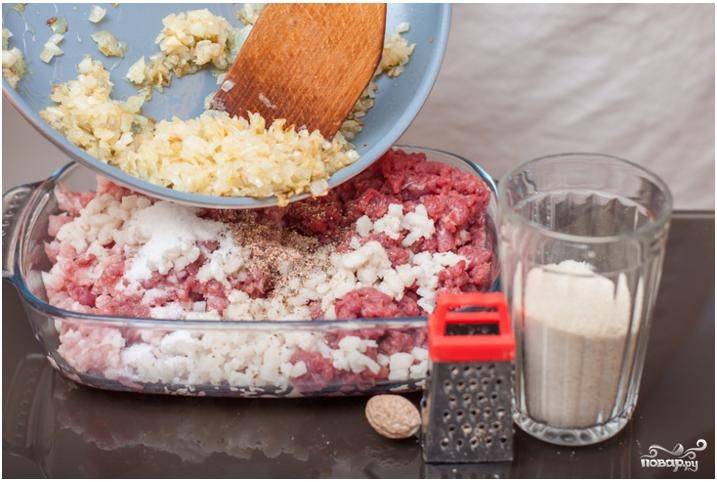 3. Подождите, пока лук остынет, и добавьте его к фаршу, посолите и поперчите по вкусу, всыпьте сухари, гвоздику и мускатный орех. У меня мускатный орех был целый, поэтому я предварительно измельчила его на терке.