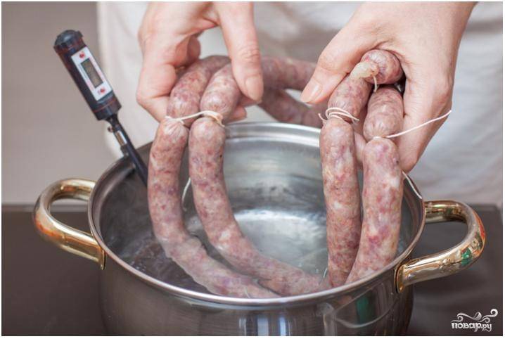 6. Достаньте колбаски из холодильника, дайте им нагреться. Проколите их зубочисткой в нескольких местах, чтобы не лопнули при варке. В широкую кастрюлю налейте воду, нагрейте её до 80 градусов. В горячую воду опустите колбаски, при этом вода практически сразу станет градусов на 10 холоднее. Поставьте кастрюлю на огонь и снова нагрейте воду до 80 градусов. Таким образом и при такой температуре варите колбаски около 20 минут. Если температура будет выше, то фарш может разделится на сваренный фарш и бульон. Венские колбаски готовы!