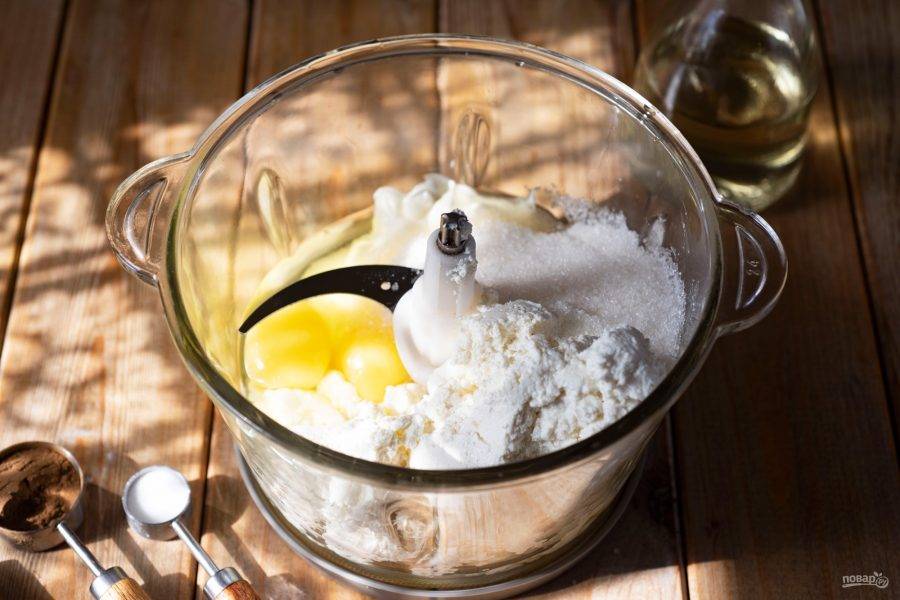 В просторную чашу блендера выложите творог, сметану, сахар, вбейте яйца.
