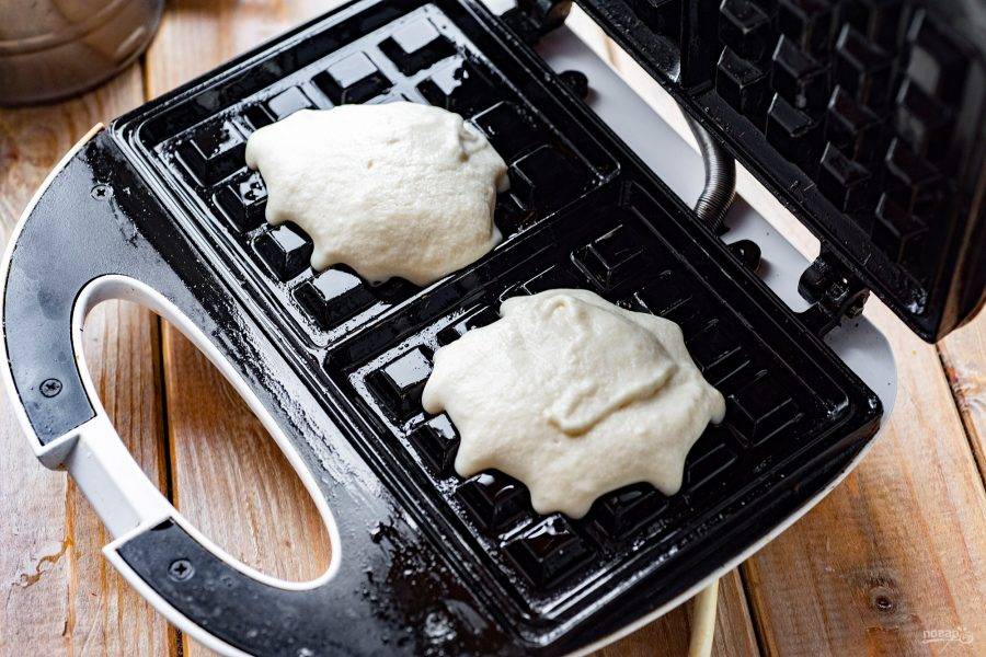 Включите разогреваться электровафельницу. Смажьте растительным маслом рабочие поверхности, воспользовавшись силиконовой кистью. Выложите в каждую ячейку для вафель по 1 столовой ложке теста. Выпекайте вафли 2-4 минуты.