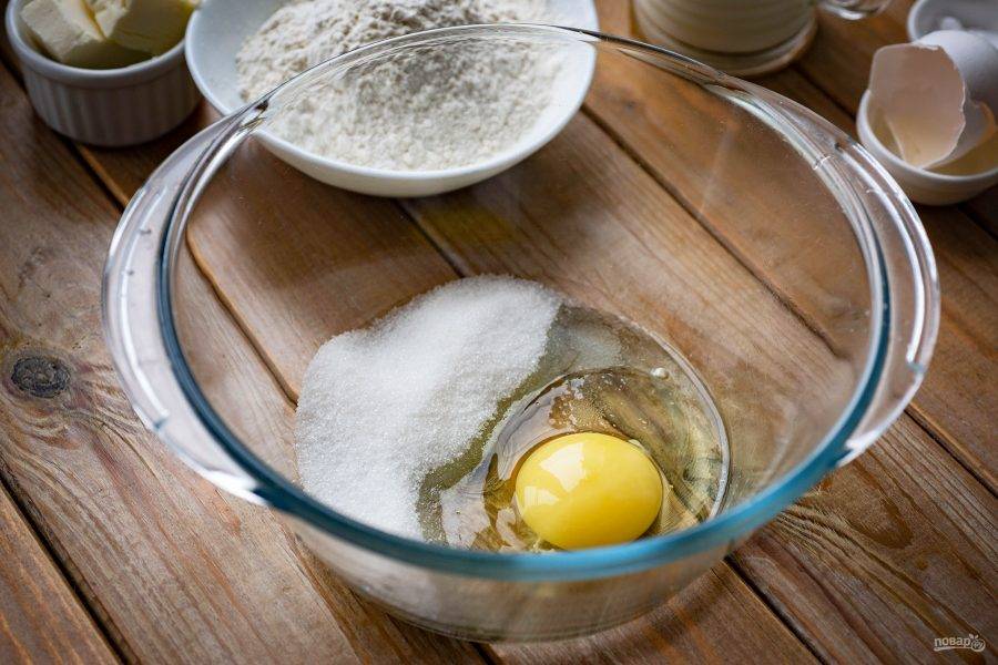 В миску вбейте яйцо и добавьте сахар. Взбивайте эти ингредиенты миксером примерно 20-30 секунд.