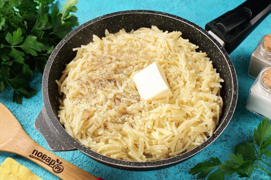 Готовую вермишель откиньте на дуршлаг и отправьте в сковороду. Добавьте кусочек сливочного масла, соль и перец по вкусу и прогрейте пару минут.