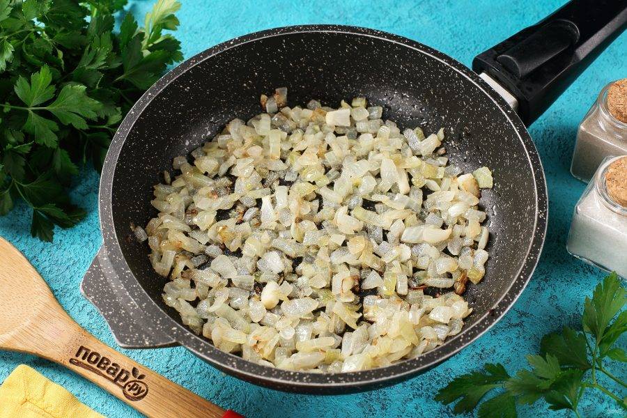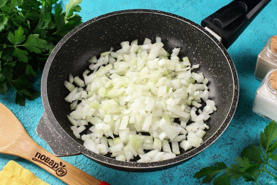 Разогрейте сковороду с растительным маслом и выложите лук, нарезанный кубиками.