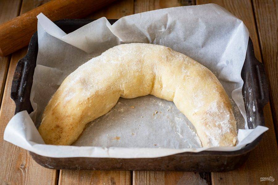 Скатайте тесто рулетом, придайте ему форму полумесяца, выложите на противень, застеленный пергаментом для выпечки, по желанию смажьте поверхность теста взболтанным яйцом. Выпекайте вертуху в уже разогретой до 180 градусов духовке в течение 35-40 минут. В итоге у вас должно получиться две такие вертухи.