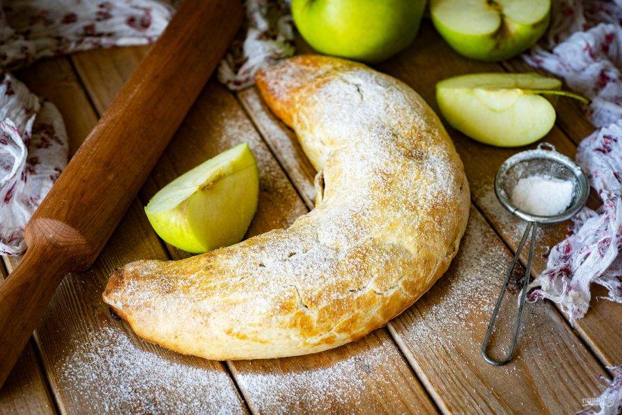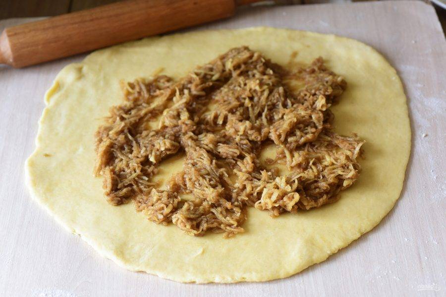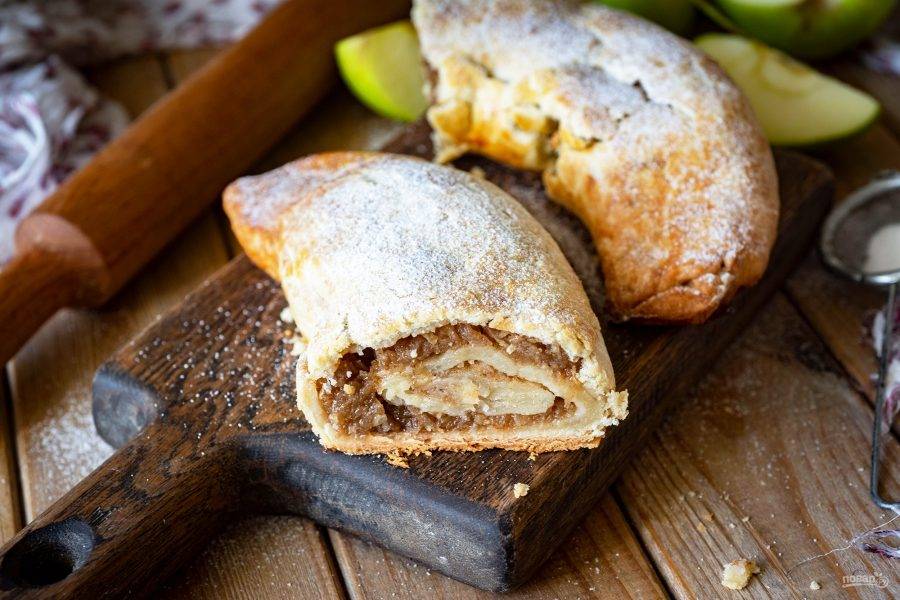 Выложите половину яблочной начинки, равномерно распределяя по поверхности, на один пласт. Чуть присыпьте крахмалом, если считаете, что начинка у вас чрезвычайно сочная.