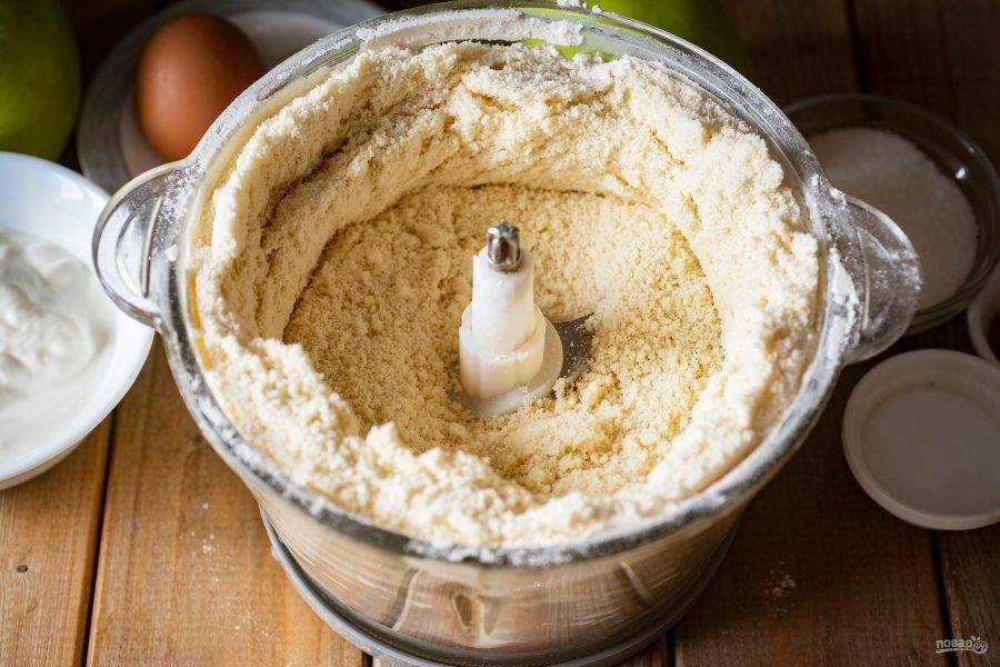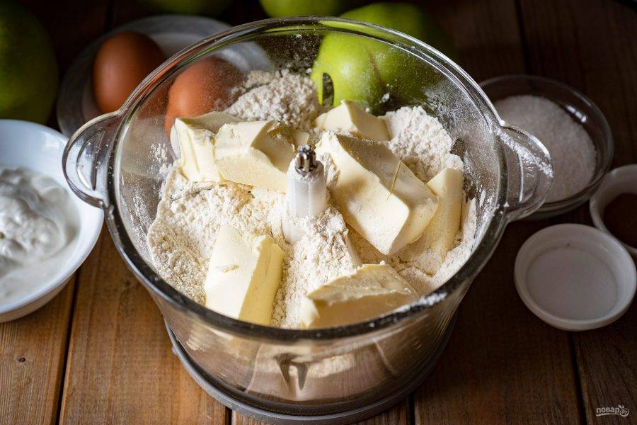 В чашу блендера выложите всю муку и холодное сливочное масло, нарезанное кусочками для удобства.