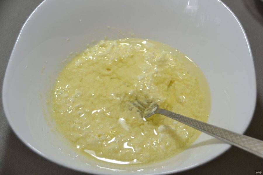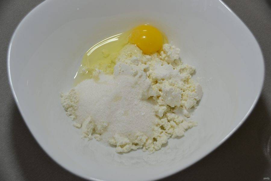 Выложите в миску творог, сахарный песок (60 грамм), яйцо, разрыхлитель для теста, ванилин, щепотку соли.