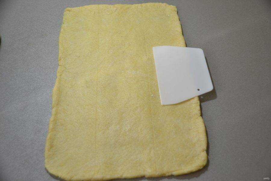 Раскатайте тесто в прямоугольный пласт, наметьте по центру линию выкладки начинки.