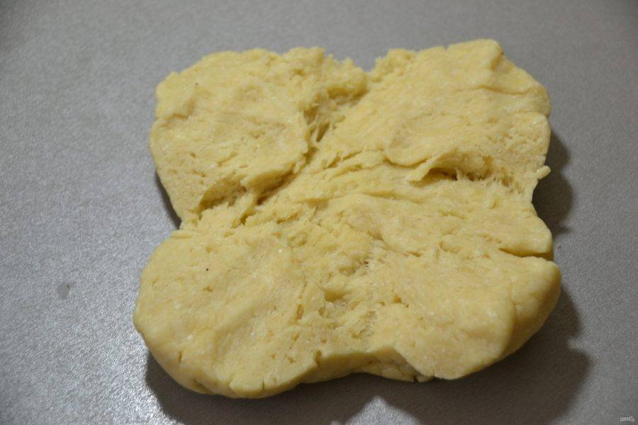 Для того, чтобы тесто раскатать в прямоугольный пласт, сделайте на колобке теста крестообразный надрез.