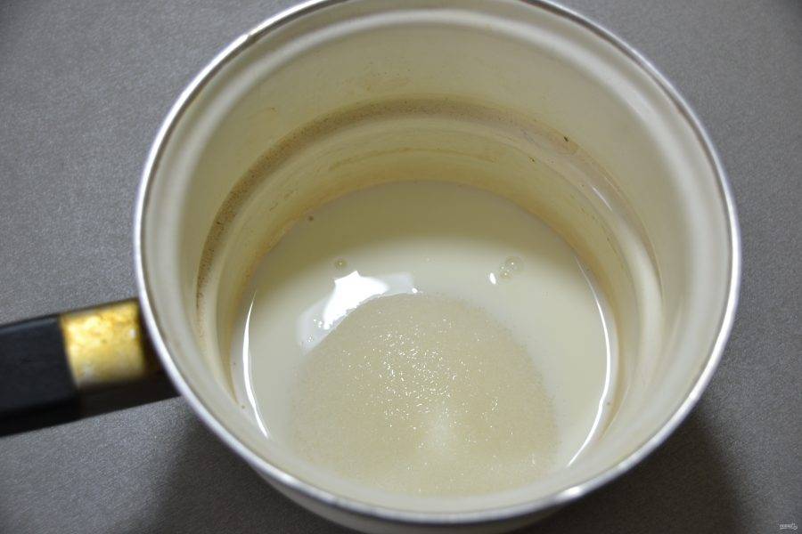 В ковш влейте молоко, добавьте сахарный песок.
