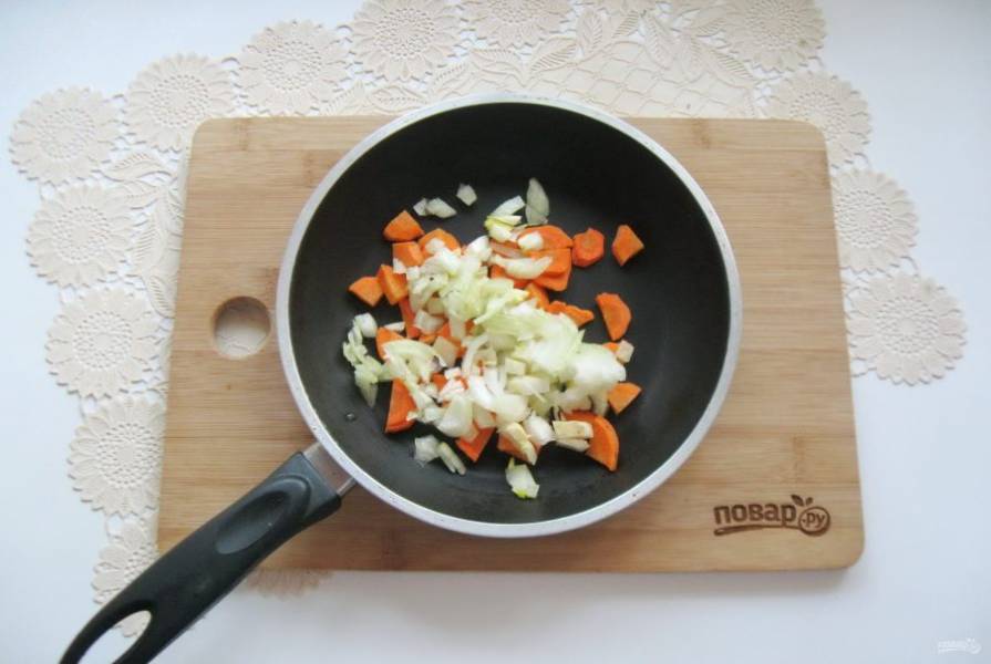 Лук и морковь очистите, помойте и мелко нарежьте. Выложите в сковороду. Налейте подсолнечное масло и припустите овощи на небольшом огне в течение 8-10 минут перемешивая.