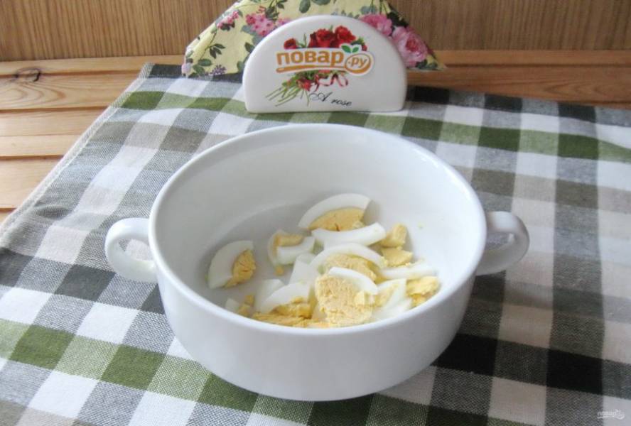 Яйца сварите вкрутую, охладите, очистите и мелко нарежьте. При подаче выложите яйцо в тарелку.