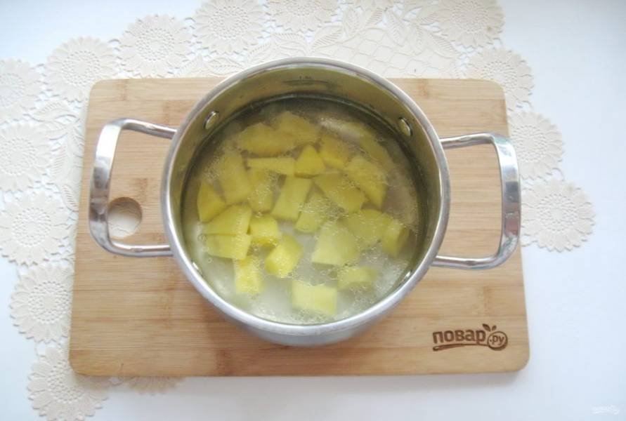 В кастрюлю налейте бульон, у меня куриный. Картофель очистите, помойте и нарежьте кубиками. Выложите в кастрюлю.