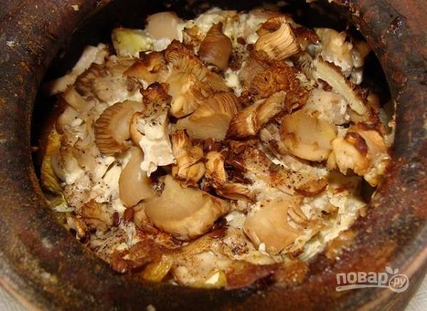 6. В оставшейся воде разведите сметану или майонез, вылейте в горшочки. Отправьте их в духовку (холодную!), установите температуру 180 градусов и запекайте около 35 минут.
