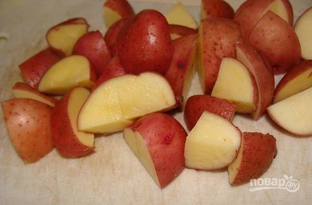 4. Вымойте картофель. Молодой можно не чистить. Нарежьте небольшими кубиками и отправьте в горшочки.
