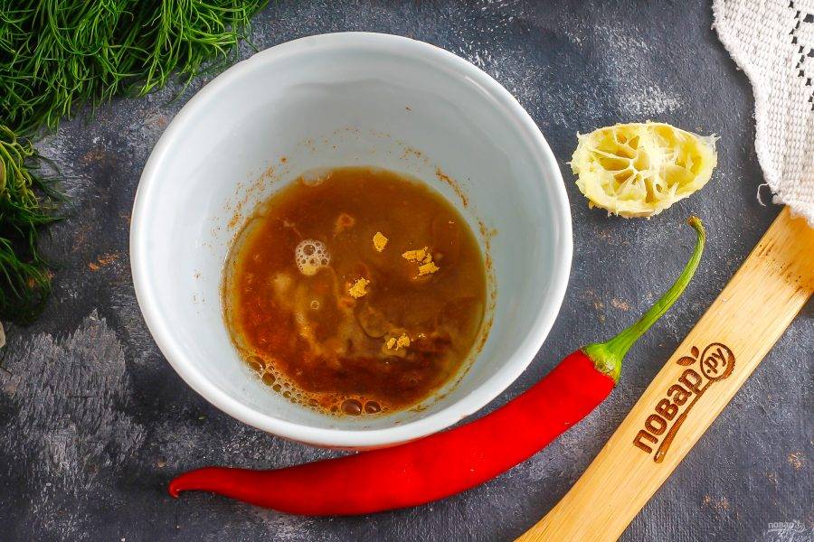 Наденьте перчатки и нарежьте промытый стручок перца чили мелко-мелко, добавляя его в емкость к остальным ингредиентам. Аккуратно перемешайте. Без перчаток нарезка перца может обжечь вам руки.