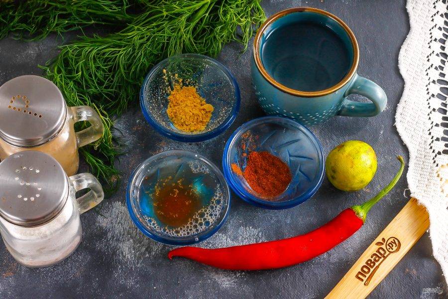 Всыпьте в глубокую пиалу или креманку молотую паприку, молотый сушеный чеснок, соль и молотый черный перец. Влейте воду и рыбный соус.