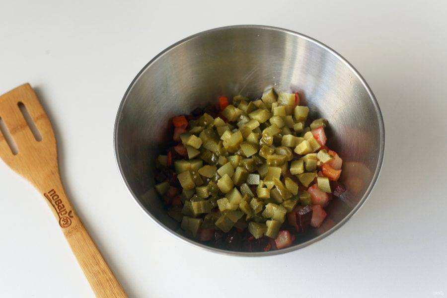 Переложите остывшие овощи в глубокую миску и добавьте соленые огурцы, нарезанные примерно такими же кубиками.