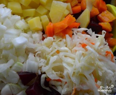 Для начала нам необходимо отварить свеклу и морковь, очистить от кожуры. Теперь нарезаем свеклу на небольшие квадратики.