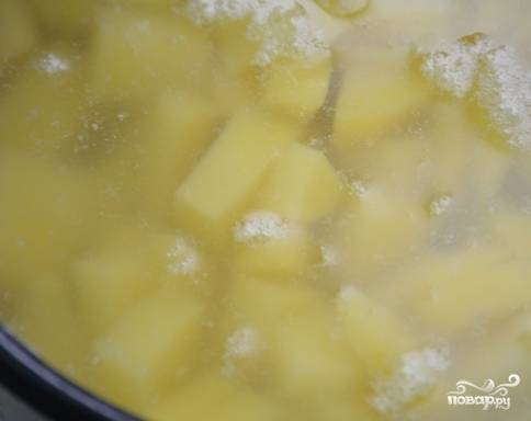 Теперь чистим картофель, нарезаем кубиками и опускаем в кипящую воду. Варим в течение 5-6 минут.