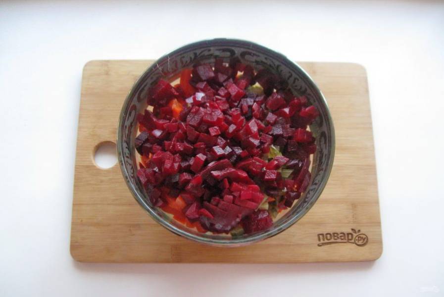 Свеклу сварите в кожуре, охладите, очистите и мелко нарежьте. Выложите в салатник с остальными овощами.
